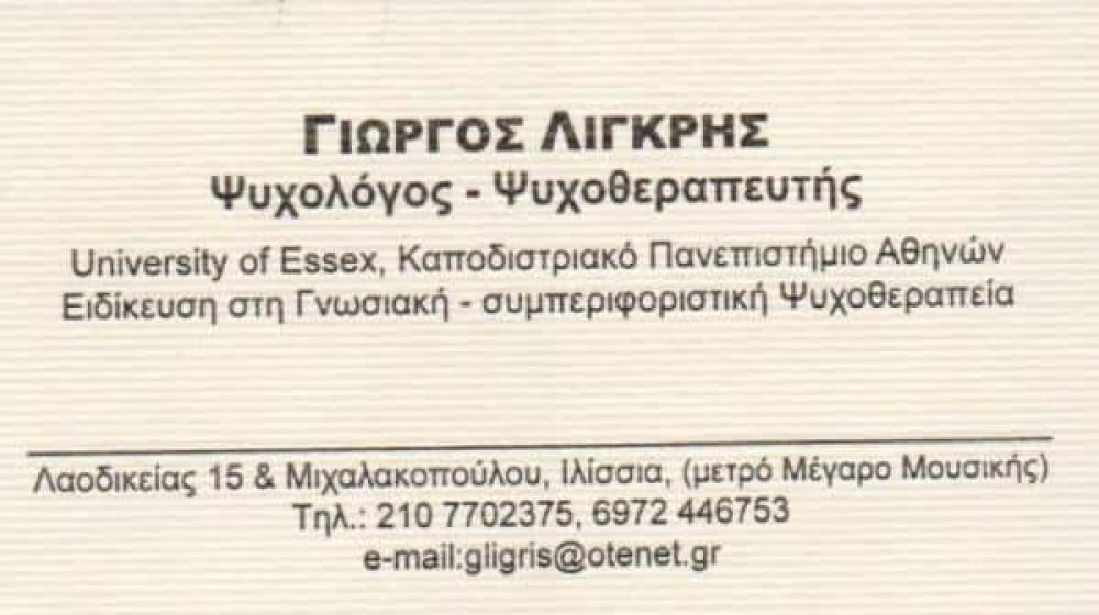 Ο Γιώργος Λίγκρης είναι ψυχολόγος με άδεια ασκήσεως επαγγέλματος (αρ. πρωτ. 7751/03) από το 2003. Σπούδασε ψυχολογία στο Πανεπιστήμιο του Essex της Μεγάλης Βρετανίας και μετεκπαιδεύτηκε στη Γνωσιακή Συμπεριφοριστική Θεραπεία. Είναι πιστοποιημένος ψυχοθεραπευτής από την Ευρωπαϊκή Εταιρεία Γνωσιακής Συμπεριφοριστικής Θεραπείας.