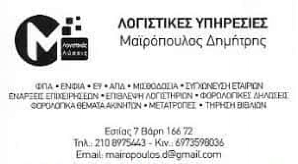 ΛΟΓΙΣΤΙΚΟ ΓΡΑΦΕΙΟ ΒΑΡΗ ΑΤΤΙΚΗΣ , ΛΟΓΙΣΤΕΣ ΒΑΡΗ ΑΤΤΙΚΗΣ, ΦΟΡΟΤΕΧΝΙΚΕΣ ΥΠΗΡΕΣΙΕΣ ΒΑΡΗ ΑΤΤΙΚΗΣ, ΦΠΑ ΒΑΡΗ ΑΤΤΙΚΗΣ , ΙΣΟΛΟΓΙΣΜΟΣ ΒΑΡΗ ΑΤΤΙΚΗΣ , ΤΗΡΗΣΗ ΒΙΒΛΙΩΝ ΒΑΡΗ ΑΤΤΙΚΗΣ, ΜΙΣΘΟΔΟΣΙΕΣ ΒΑΡΗ ΑΤΤΙΚΗΣ, ΛΟΓΙΣΤΙΚΟ ΓΡΑΦΕΙΟ ΜΑΙΡΟΠΟΥΛΟΣ ΔΗΜΗΤΡΗΣ ΒΑΡΗ ΑΤΤΙΚΗΣ